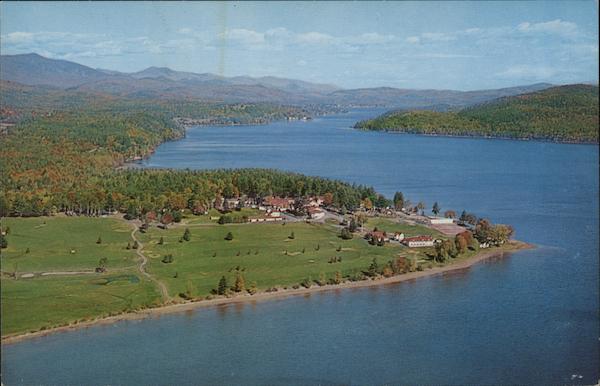 | Looking north over Scarron Manor, famous resort showing part of Golf Course and the beautiful sandy beaches along the shore. In the distance is seen part of the high peak country of the Adirondacks, while the clear blue waters contrast with the colorful foliage. |