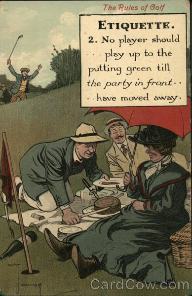Front: CHA CROMBIP The Rules of Golf ETIQUETTE. 2. No player should play up putting green till to the the party in front.. have moved away. Mod Back: Valentine's Series SOUVENIR POST GARD