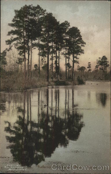 Front: EL.MERROW Sxand-Colored, "Reflections" McKenzie's Pond. Pinehurst, N. C. Back: CARD/ Midnigh inscend to DEC 25 8 PM CENTS 2 A: Cheen tall Andern luck for 1921 Flar6 Alma London The Albertype Co., Brooklyn, N. Y.! 4. Dhe St Anglanti