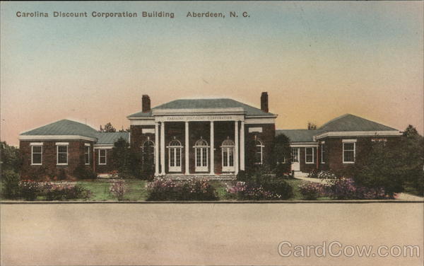Front: Carolina Discount Corporation Building Aberdeen, N. C. CAROLINA DISCOUNT CORPORATION Back: PUBLISHED BY FOX DRUG CO., ABERDEEN, N. C. HAND-COLORED