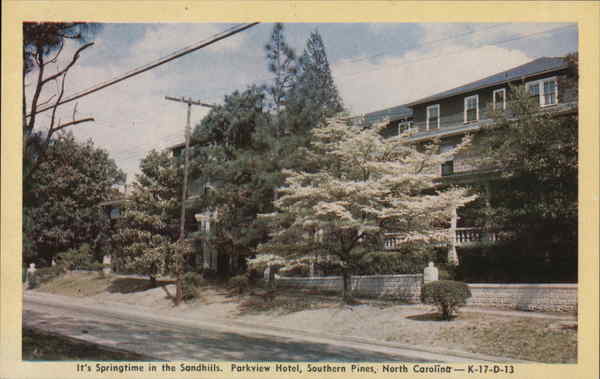 Front: It's Springtime in the Sandhiils. Parkview Hotel, Southern Pines, North Carolina-K-17-D-13 Back: Published by Hayes Sandhill Bookshop, Southern Pines, N. C. 35162 Dextone Genuine Natural Color-Made only by Dexter Press, Pearl River, N. Y.