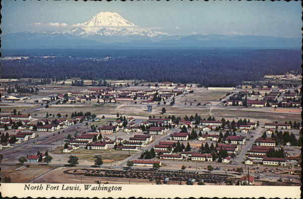 | This aerial view of a portion of the Army Center of the Northwest shows some of the barracks, parade field and their eternal guardian, Mt. Rainier, 60 miles to the east. these barracks have housed soldiers of World War II, Korean Conflict and Viet Nam. |