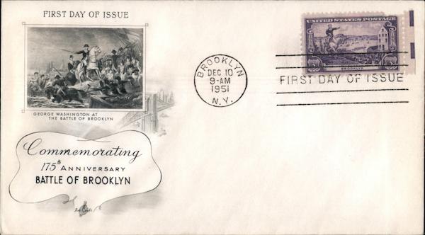 FIRST DAY OF ISSUE GEORGE WASHINGTON AT THE BATTLE OF BROOKLYN Commemorating 175 ANNIVERSARY BATTLE OF BROOKLYN Art Craft ROOKL DEC 10 Z 9-AM 1951 N.Y. BROOKLYN FIRST DAY OF ISSUE