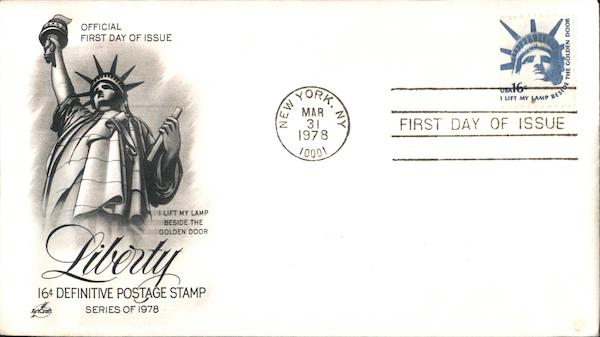 MERTZE OFFICIAL FIRST DAY OF ISSUE I LIFT MY LAMP BESIDE THE GOLDEN DOOR 16¢ DEFINITIVE POSTAGE STAMP ArtCraft SERIES OF 1978 YORK 31 1978 10001 NY USA16 I LIFT MY LAMP PE THE GOLDEN DOOR BESTO FIRST DAY OF ISSUE