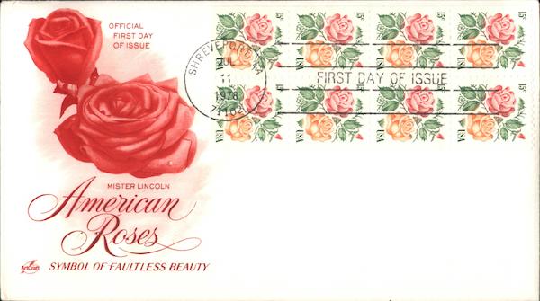 OFFICIAL FIRST DAY OF ISSUE MISTER LINCOLN Roses ArtCraft SYMBOL OF FAULTLESS BEAUTY SHREVE 9.78 1102 FIRST DAY OF ISSUE USA