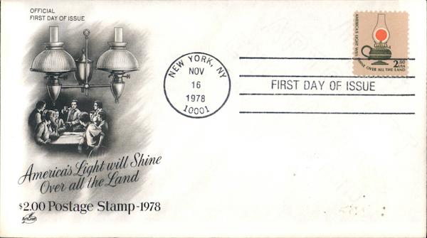 OFFICIAL FIRST DAY OF ISSUE America's Light will Shine Over all the Land $2.00 Postage Stamp-1978 ArtCraft YORK, NOV 16 1978 10001 NY AMERICA'S LIGHT WILL HINE LAIS .00 OVER ALL THE LAND FIRST DAY OF ISSUE