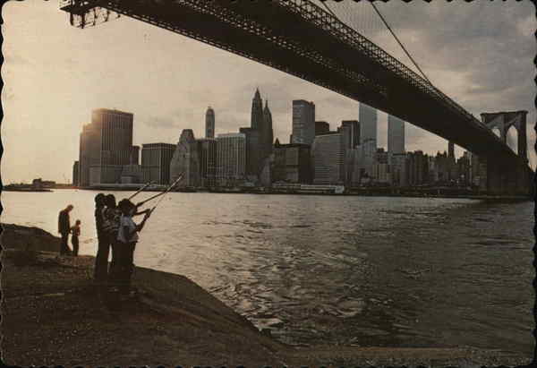 These young anglers are enjoying the great outdoors while viewing the awe-inspiring Lower Manhattan Skyline from under the Brooklyn Bridge. C-224 MANHATTAN 68079-D Photo by John Quigley Lantero dp DEXTER PRESS WEST NYACK, NEW YORK
