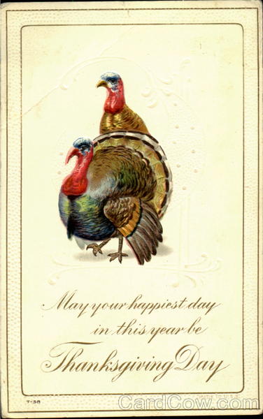 Front: T-58 May your happiest day in this year be Thanksgiving Day MAD 1 U.S.A. Back: 50 Mr Sewis Follett J Woonsocket R.J B.J.D.No.2