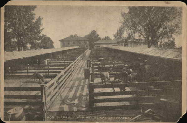 Front: HOG SHEDS-ILLINOIS BIOLOGICAL LABORATORY Back: COMPLIMENTS OF THE PLACE THE STATE BOARD OF Libe Stock Commissioners SPRINGFIELD, ILL.
