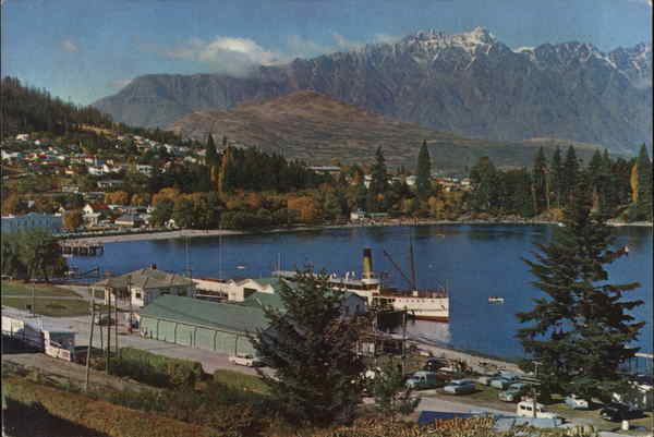 | Queenstown, N.Z. In the autumn Queenstown is noted for the brilliance of its golden foliage on poplars, willows and birch trees. The T.S.S Earnslaw carries visitors on scenic trips to the head of Lake Wakatipu to Routeburn and Paradise Valleys. The Remarkables 7688 ft. are noted for vivid red colourings at sunset. |