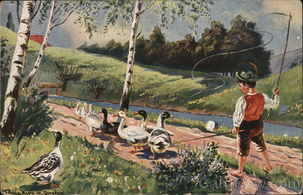 Boy Walking with Ducks Near Water