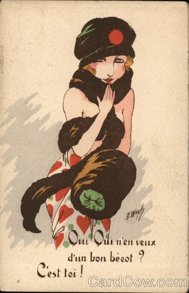 Front: n'en veux d'un bon bécot ? C'est toi ! Back: FANTAISIES PARISIENNES AQUARELLEES LES QUI QUI DE LOLOTTE SÉRIE NO 34 PAR A. WUYTS