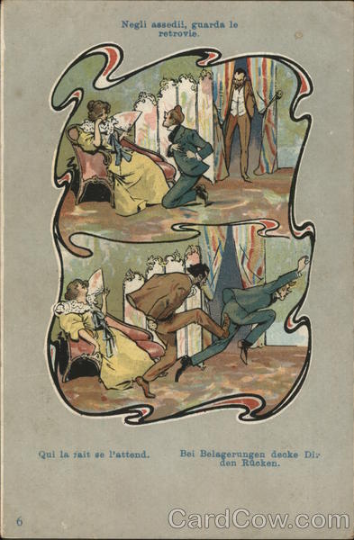 Front: Negli assedii, guarda le retrovie. Bei Belagerungen decke Dir den Rueken. Qui la rait se l'attend. 6. Back: POSTKARTE - CARTOLINA POSTALE LEVELEZĂ– LAP-DOS PINICE Union postale univerzelle - Unione postale universale BREFKORT 396 UEDO SEE