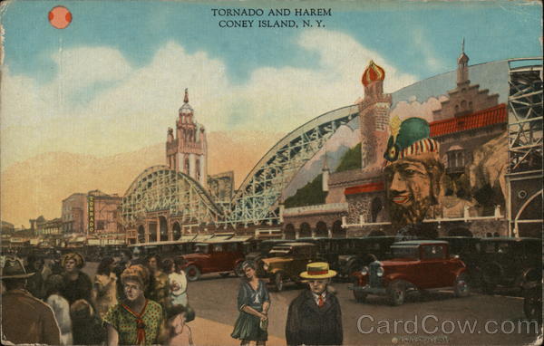 Front: *** In TORNADO AND HAREM CONEY ISLAND, N. Y. 55 14 Offe Ou Pere 20 11/ Back: 12 MANHATTAN CARD PUB. CO. €8 HERE