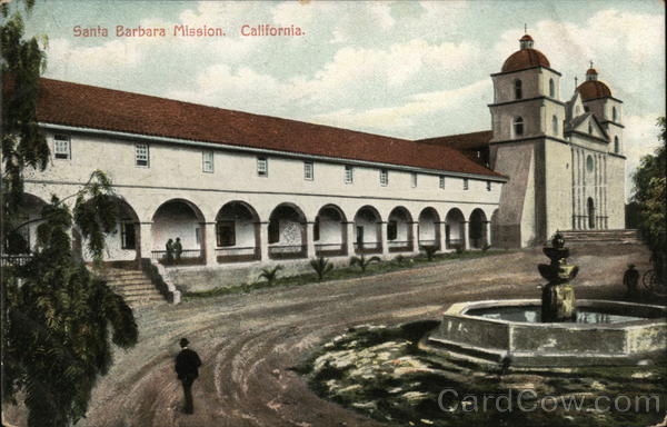 Front: 1625 1*2* Santa Barbara Mission. California. *** *** Back: No. 6107 Publ. by Newman. Post Card Co., Los Angeles, Cal. (Male in Germany.) Write here. POST CAR D. 50.30 Cuba 1 c 2 c