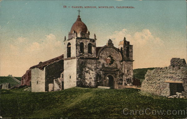 Front: 58 - CARMEL MISSION, MONTEREY, CALIFORNIA. Back: MADE IN AMERICA BY EDWH MITCHELL AT SAN FRANCISCO. Columbus мотров 3/65 1.50 30 THIS SPACE FOR ADDRESS ONLY