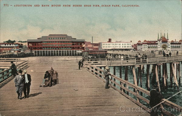 Front: 771 AUDITORIUM AND BATH HOUSE FROM HORSE SHOE PIER, OCEAN PARK, CALIFORNIA. Je Back: Post Card- EDWARD H. MITCHELL, PUBLISHER, SAN FRANCISCO. THIS SPACE FOR ADDRESS ONLY