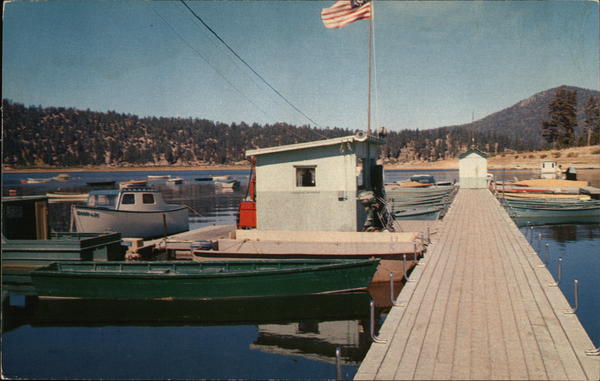 | Typical Boat Landing - Big Bear Lake, California - At various locations, dotting the shore line are many boat landings. These are used by fishermen in the summer and duck hunters in the fall. Later the landings and boats are pulled ashore to await spring as Big Bear Lake is completely frozen over during the winter months. |