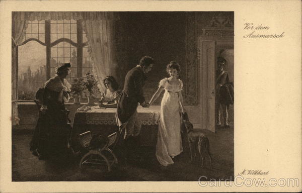Front: Vor dem Ausmarsch M.Volkhart Back: Verzeichnisse von Büchern, Bildern und Kunstpostkarten umsonst und postfrei. No. 249 Verlag Hermann A. Wiechmann, München. RAUM □ FÜR O □ DIE O MARKE