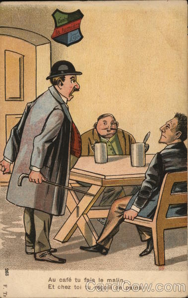 Front: 263 F. Tr Contre la lumière (0) Au café tu fais le malin, Et chez toi tu reçois de pains. Back: 814 He atendens at Ce côté est exclusivement réservé à l'adresse M. Willy Schmidt LEIPZIG, Elisenstr. 47.