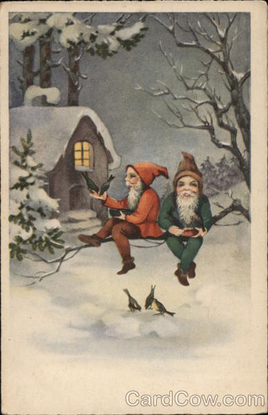 Two elves sit on a tree branch in a snow-covered land, feeding the birds.