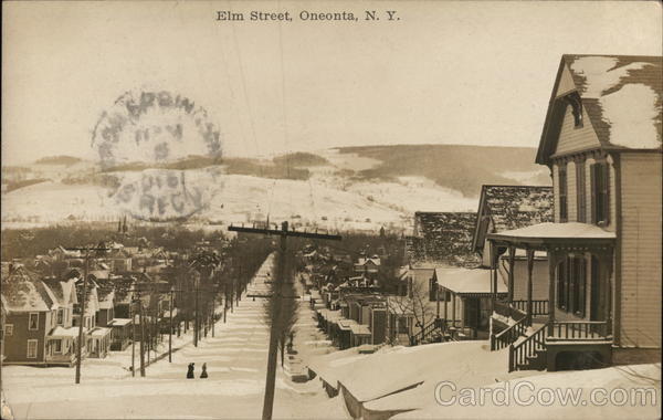 Front: RO LEGY Elm Street, Oneonta, N. Y. Back: SOUVENIR FROM CONEONTA, N. Y. PUB. BY ONEONTA DEPARTMENT STORE Pad Arome B.C ars soon HEONA MARC F. 10 Miss Mildred Chamberlain Sharon Springs Scho Co N. Y J.P. Eldredge D NO Q 2