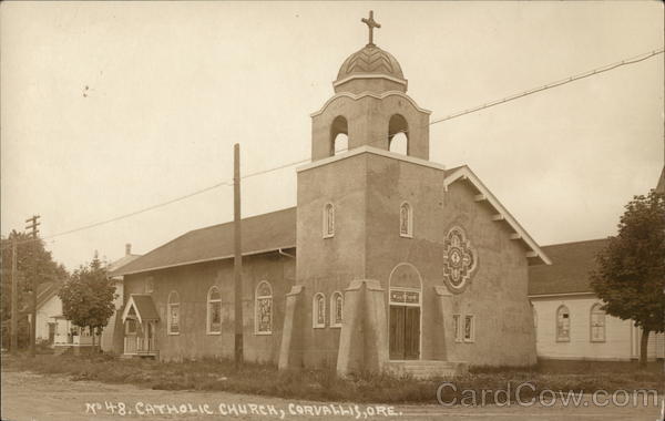 Front: 00 No 48. CATHOLIC CHURCH, CORVALLIS,ORE. Back: PUBLISHED BY PATTON POST CARD CO. SALEM, ORE. AA 20 4 NOA AANO A A AZOA NAME AND ADDRESS HERE