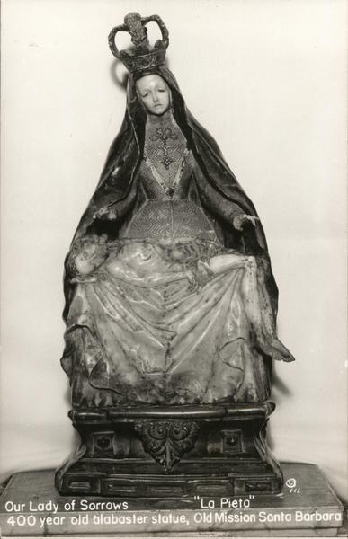 Front: 114 Our Lady of Sorrows "La Pieta" 400 year old alabaster statue, Old Mission Santa Barbara Back: PHOTO POST CARD; ANGELENO PHOTO SERVICE - 1030 SO. ALVARADO, L. A. 6, CALIF. - 2 1.00 75 Kodak -- Paper --