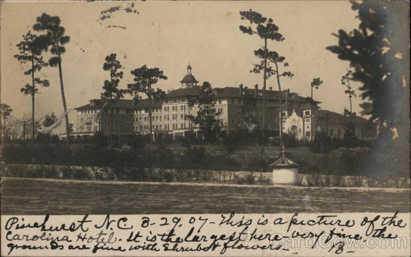Front: Pinehurst M.C 8-2 07- This is a picture Carolina Hotel. It is the largest here very fine. are fine of the - Back: EHUE POST CARDA N.C Miss. R. Mr. Beaure 29 5PM SERIES 1902 NITED STATES OF 206 FRANKLIN 1790 Weiter Village 800