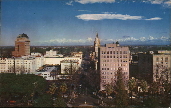 From the dome of the State Capitol much of the downtown section can be viewed. Pictured is a view of 11th Street with part of Hotel Senator on the far right, the Cathedral in the center and the old California Western States Life Insurance Company Building looming over the city at the left. |