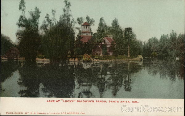 Front: LAKE AT "LUCKY" BALDWIN'S RANCH, SANTA ANITA, CAL. PUBLISHED BY E. P. CHARLTON & CO. LOS ANGELES, CAL. Back: Post Card- TWO CENTS