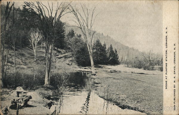 Front: SCENE AT PUMPING STATION, LEBANON, N. H. 3504-PUBLISHED BY H. K. DAVIS, LEBANON, N, H. Back: N. E, PAPER & STATIONERY CO. MFRS. AYER, MASS. HERE