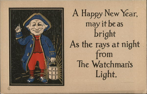 Front: A Happy New Year, may it be as bright As the rays at night from The Watchman's Light. Back: NEW YORK OS POST CARD. 282 MADE IN U.S.A. This Side For Correspondence. The Address To Be Written On This Side. LONDON. 632 GOLD MEDAL ART, TRADE MARK
