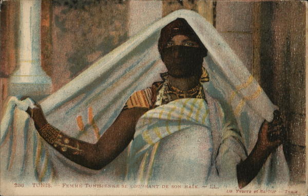 TUNIS.- FEMME TUNISIENNE SE COUVRANT DE SON HAŤK. - LL.