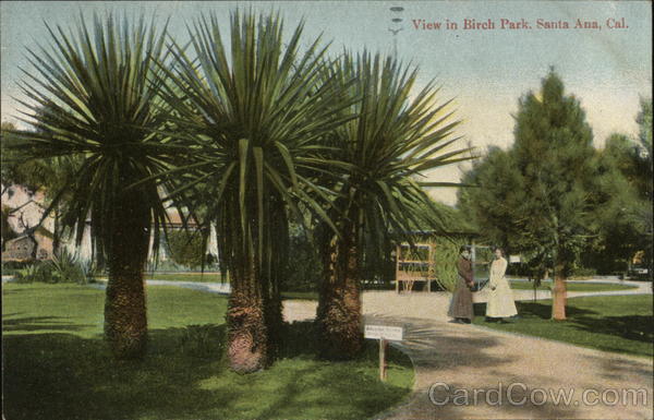 Front: View in Birch Park. Santa Ana, Cal. FVOED Back: PUBLISHED BY NEWMAN POST CAND Co LOS ANGELES 405/% FRE ON THIS SIDE Isiana Pos- Cuba Foongn Ic. 2c