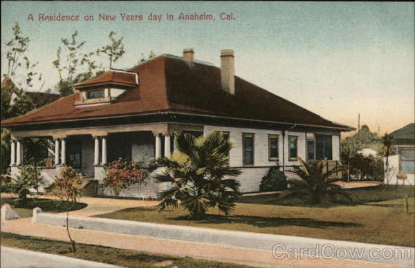 Front: A Residence on New Years day in Anaheim, Cal. PLA Back: FIAT J. Helmsen, Anaheim, Cal. Auman POST CARD Company 55 LOS ANGELES M. Cuba 1910 Canton week on way to diverside 1c 2 c