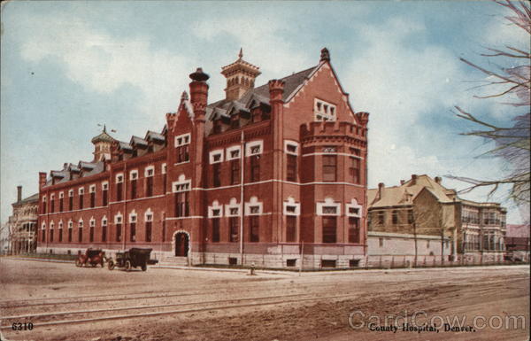 Front: 6310 19 nar 巴中 County Hospital, Denver. Back: ou BA This Space Can Be Used for a Written Message. TWO CENTS.