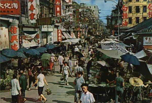 Front: 大化海 技散庄原 雪生 AGENT TEL67 אאד 元興白光 白米 成昌 Back: street Kowloon, Market Existing in the open Hong Kong. 九龍廣東道之露天街市 POST CARD STAMP Color Photograph By CHENG Ho-Choy PRINTED BY SHECK WAH TONG HONG KONG