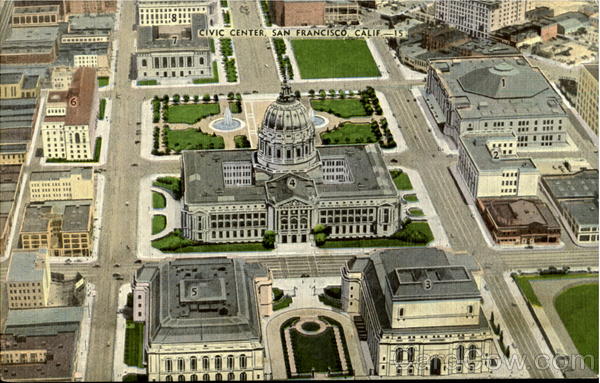 San Francisco's 23 million dollar Civic Center includes the City hall (4), the Veterans memorial Building (5), the Opera House (3), the Public Health Center (2), the civic Auditorium (1), the Public Library (7), the State Building (6), and the Federal building (8), comprising one of the finest groups of public buildings in the country. |