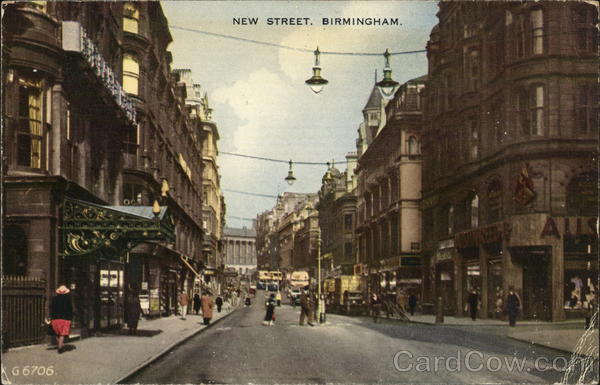 Front: NEW STREET, BIRMINGHAM. G6706. Back: "VALESQUE'' POSTCARD. COPYRIGHT. PUBLISHED BY VALENTINE & SONS LTD., DUNDEE AND LONDON. Valentine's GT. BRITAIN PRINTED.IN