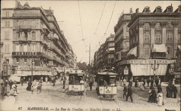 Front: DENTISTE ATENOYACE1 CPIAZAR ICARO CARINET CATSARCES AZA IZOUARD PIT FARIUC BIN 804 523 47 MARSEILLE.-La Rue de Noailles. Noailles street. Back: Carte Potale so Modele Depose LEVY FILS & C" PARIS