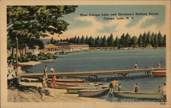 Front: West Caroga Lake and Sherman's Bathing Beach, Caroga Lake, N. Y. 67520 Back: MADE IN U. S. A "TICHNOR QUALITY VIEWS" REG. U.S. PAT, OFF. MADE ONLY BY TICHNOR BROS., INC., BOSTON, MASS. PUB. BY AMSTERDAM NEWS CO., AMSTERDAM, N. Y.
