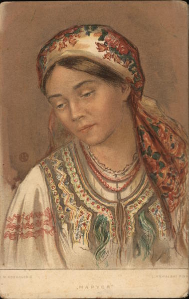 Front: 1. М. КОВАЛЬСКИЙ. L.KOWALSKI PINX МАРУСА" V-28 Back: ОТКРЫТОЕ ПИСЬМо. МЕСТО 113 CARTE POSTALES з оршины МЕСТО ДЛЯ ПИСЬМА.) мѣСТО ДЛЯ АДРЕСА та МАРКИ ВЪoСРПоль: К. Картого зав.. Ульяна, П.Г., Пряжка 5.