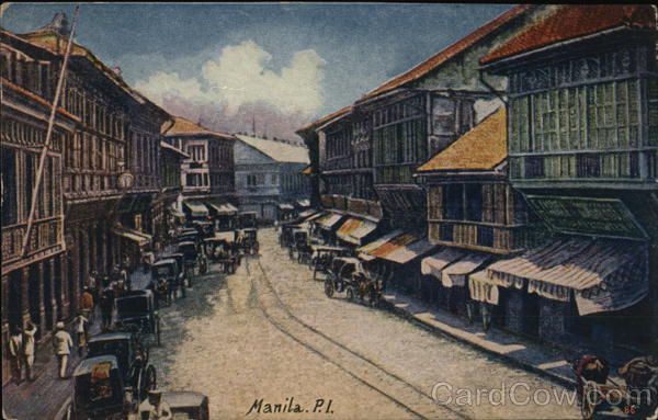 | Escolta is the main street of Binonda or New Manila, and is a well paved thoroughfare, lighted by electricity. Large dry goods and other retail stores line its sides and throngs of pedestrians, market women, carts and carriages add to its picturesqueness. |
