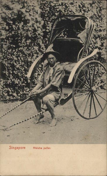 Front: Singapore Rikisha puller. Back: Straits Settlements (Établissements du Détroit) Post Card Carte Postale THIS SPACE MAY BE USED FOR COMMUNICATION. Max H. Hilckes, Singapore. No. 87.