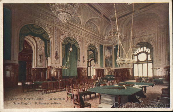 Front: CASINO DE MONTE-CARLO.- La Nouvelle Salle Empire. F. MÉDECIN, architecte Back: La correspondance au recto n'étant pas acceptée par tous les pays étrangers, se renseigna 189 ROBAUDY, CANNES
