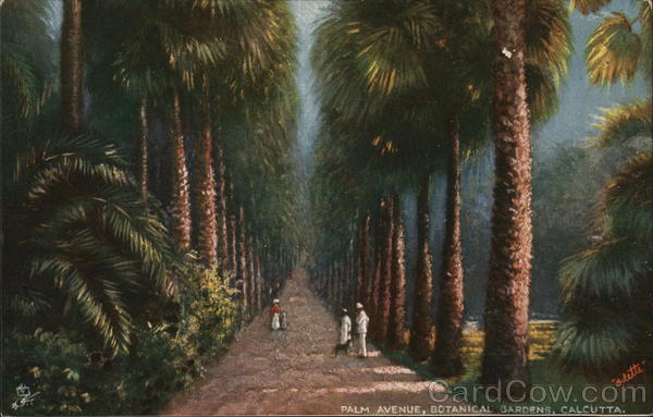 Oilette Wide Wide World Calcutta Series 7183 Palm Avenue, Botanical Garden The Royal Botanical garden on the west bank of the river were founded in 1786 on the suggestion of Colonel Kyd and have been of more service to public and private gardens of the world than any other horticultural institute. Besides possesing the rarest of plants it is celebrated for its palm avenue and the great Banyan Tree which covers ground nearly 1000 feet in circumference. |