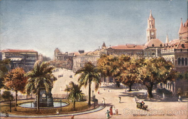 Oilette Wide Wide World Bombay India Series 7022 Rampart Row, Bombay City. Bombay is the city of contrasts. Very different is the quiet grandeur of Rampart rush and turmoils of the industrial centre of the great city. It is the very variety that makes the place so charming. Truly it is said"Bombay is a beautiful Queen in silver armour and a girdle of gold." |