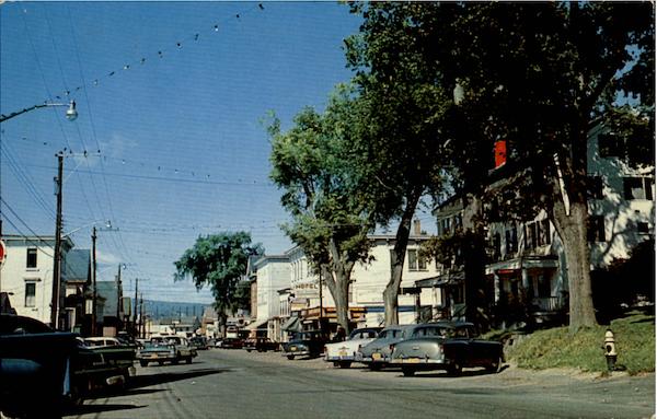 Maine showing a familiar landmark for over 150 years - the famous old Jed Prouty Tavern which welcomes travelers entering Bucksport to-day as it did when Main Street was a stage route and the "Jed Prouty" a favorite stopping place for the stage coach. |