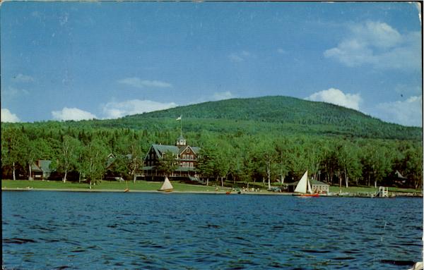 View from the lake showing the main house, lawn and beach. An American Plan resort in Maine's Rangeley Lakes Region.